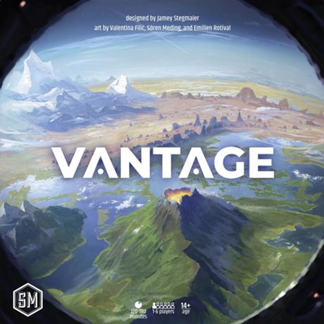 Vantage is an open-world, co-operative, non-campaign adventure game that features an entire planet to explore, with players communicating while scattered across the world. With nearly eight hundred interconnected locations on four hundred cards and over nine hundred other discoverable cards, the world is your sandbox. You begin each game of Vantage on an intergalactic vessel heading towards an uncharted planet. After crashing far from your companions, you have complete freedom as to how you explore, discover, and interact with the planet. You view your location from a first-person perspective, and you can communicate with and support other players, but you are separated by vast distances, so only you can see your current location. In addition to a mission victory, a destiny victory, or an epic victory (completing both the mission and a destiny), you may define success in Vantage through anything you pursue and achieve. Vantage is not a campaign game. Each game is a standalone experience; you bring to future sessions only what you’ve learned about the world. It is completely self-contained with no expansions — just a few accessories like metal coins. —description from the publisher